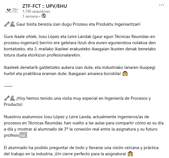 Para Eva Epelde Bejerano y para mí, como profesores de la asignatura de Ingeniería de Procesos, ha sido especialmente ilusionante ver cómo dos exalumnos aplicáis en vuestro día a día profesional muchos de los conceptos y herramientas que trabajamos en la asignatura. Precisamente buscamos eso: que la formación en Ingeniería de Procesos no se quede en lo teórico, sino que prepare de verdad para el ejercicio profesional como ingeniero/a de procesos.